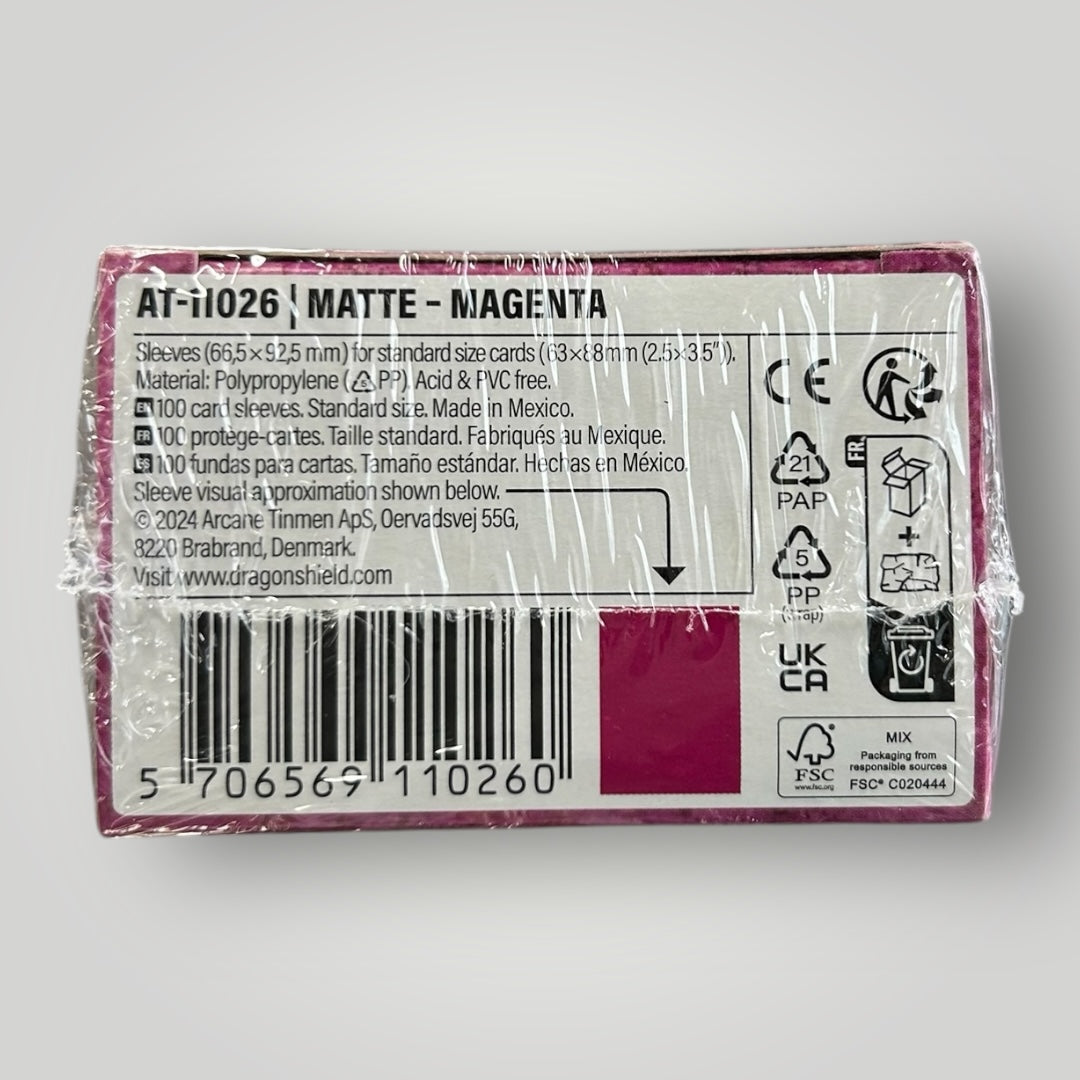 Premium card sleeves. 100 card sleeves. Comes in Magenta Matte color on backing of sleeves.