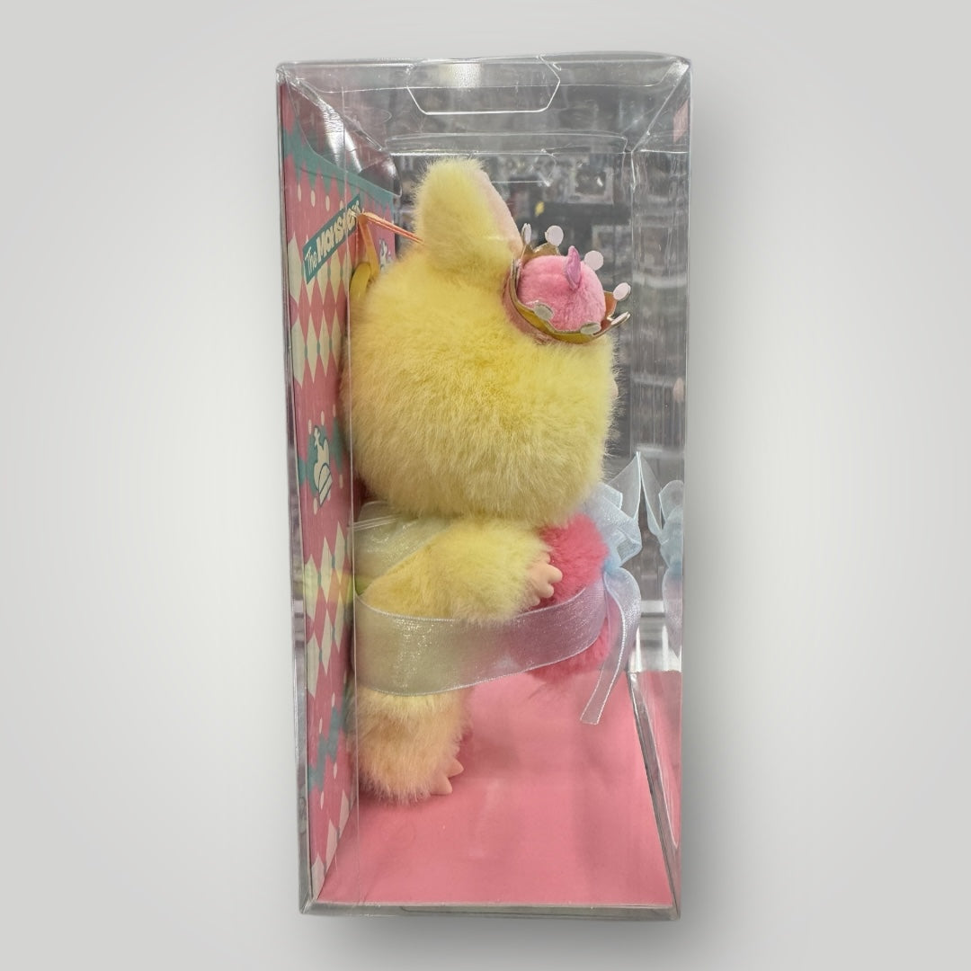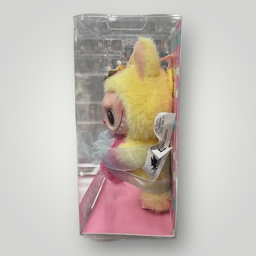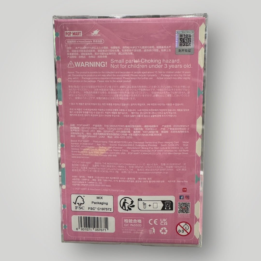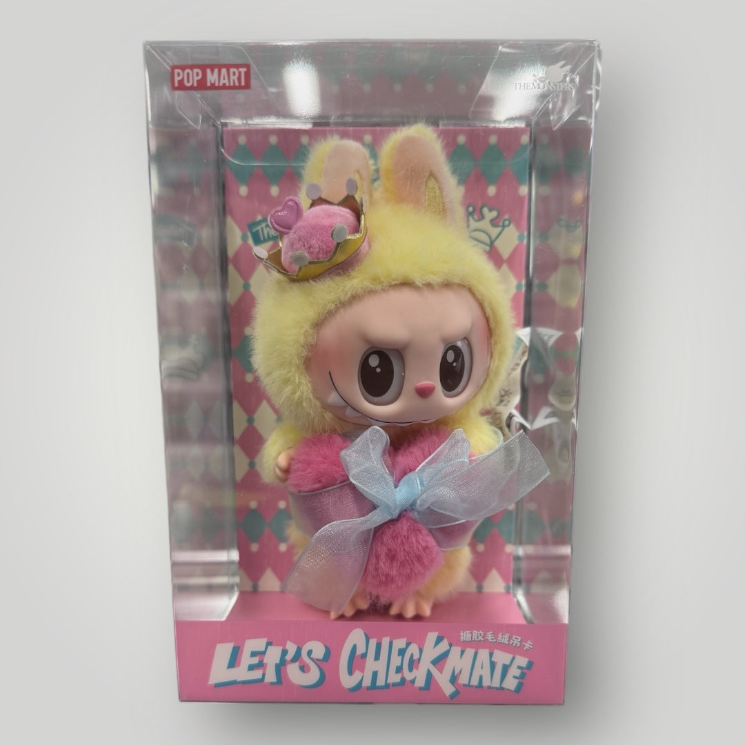 The Monsters, Labubu Let’s checkmate, still in plastic protector holding a pink heart and wearing a stylish crown.