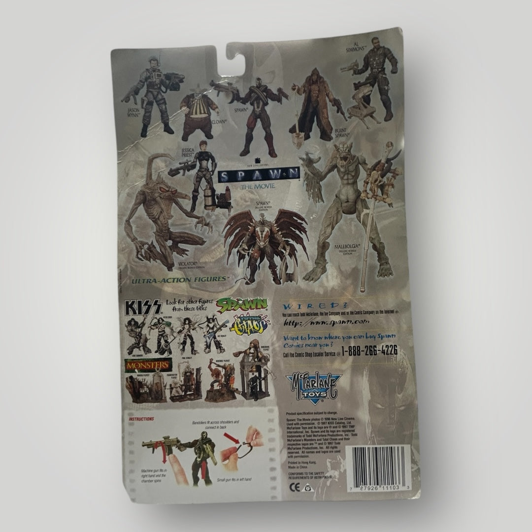 The 1997 McFarlane Spawn the Movie Unmasked Spiked Spawn 6" Figure is a collectible action figure from the Spawn franchise. This plastic figure stands at 6 inches tall and is a 1:12 scale representation of the character Spiked Spawn. Manufactured by McFarlane Toys in China, this original licensed reproduction is a must-have for fans of comic book heroes and the Spawn series.
