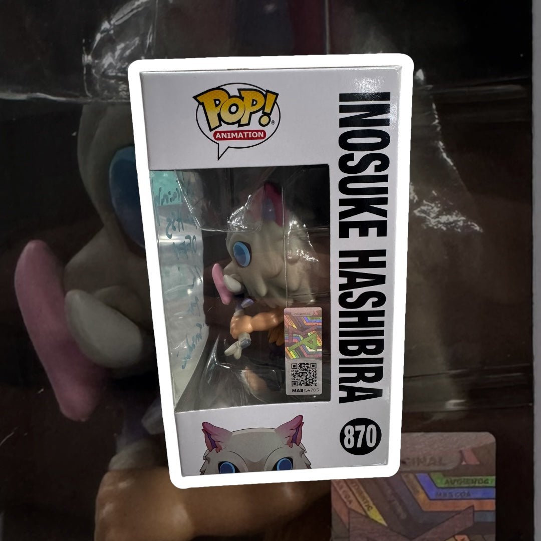 Enhance your Demon Slayer collection with this autographed Inosuke Hashibira Pop! figure, signed by voice actor Bryce Papenbrook. Keep it safe in the included pop protector, a must-have for any collector. Limited quantities available. Don't miss out!
