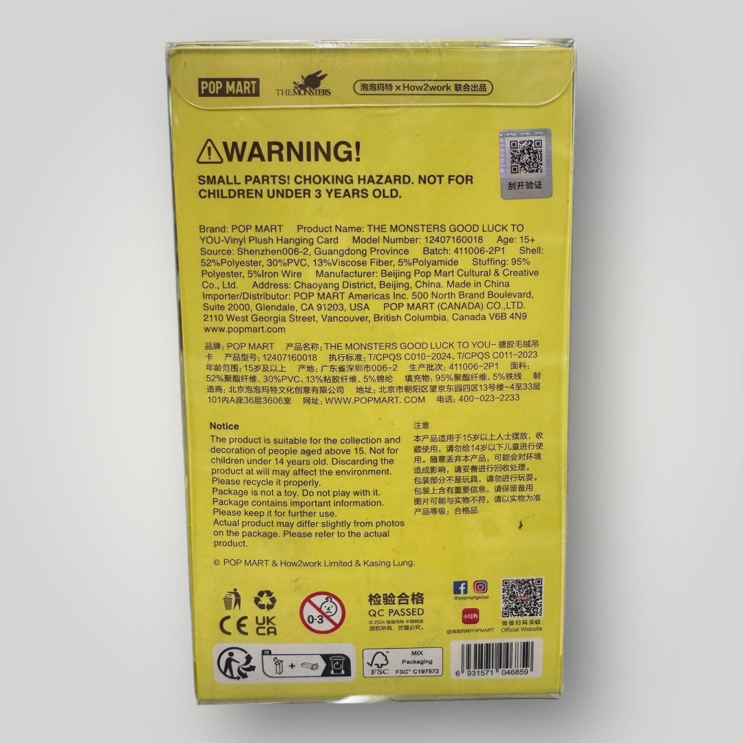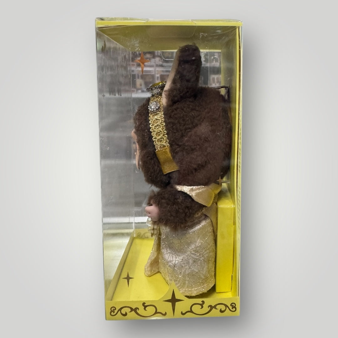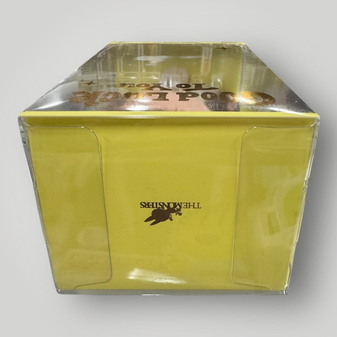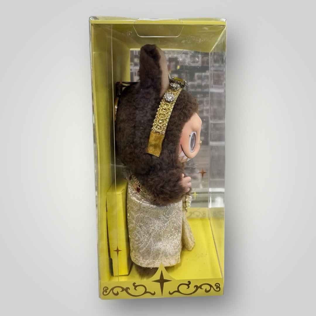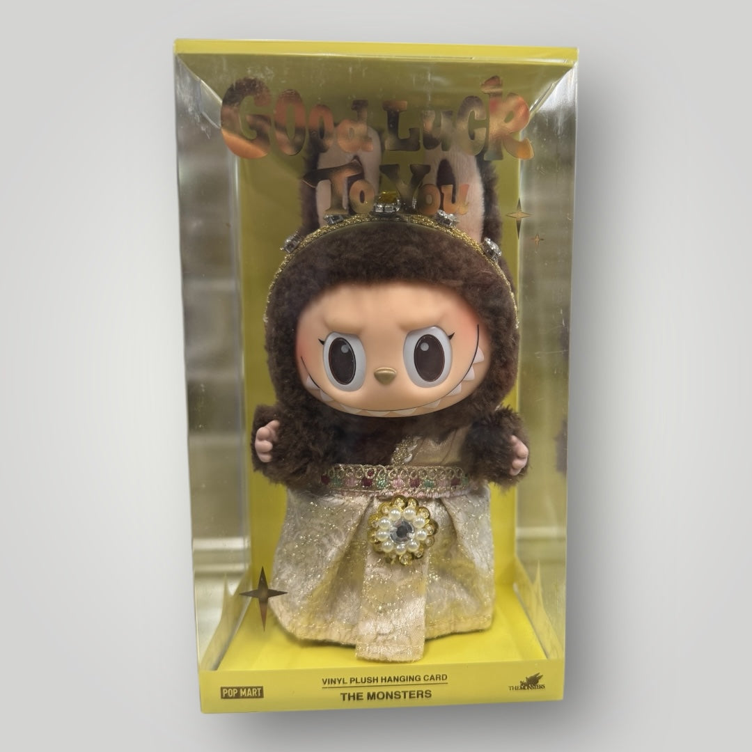 The monsters Labubu Good luck To you in its plastic protector styling a jewel covered dress and tiara