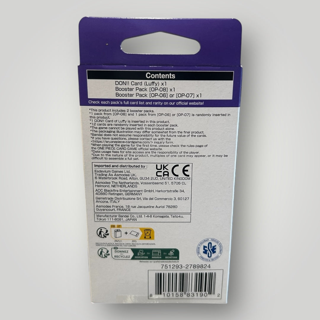 This set comes with 2 booster packs and a DON!! card featuring a special illustration of Luffy!
